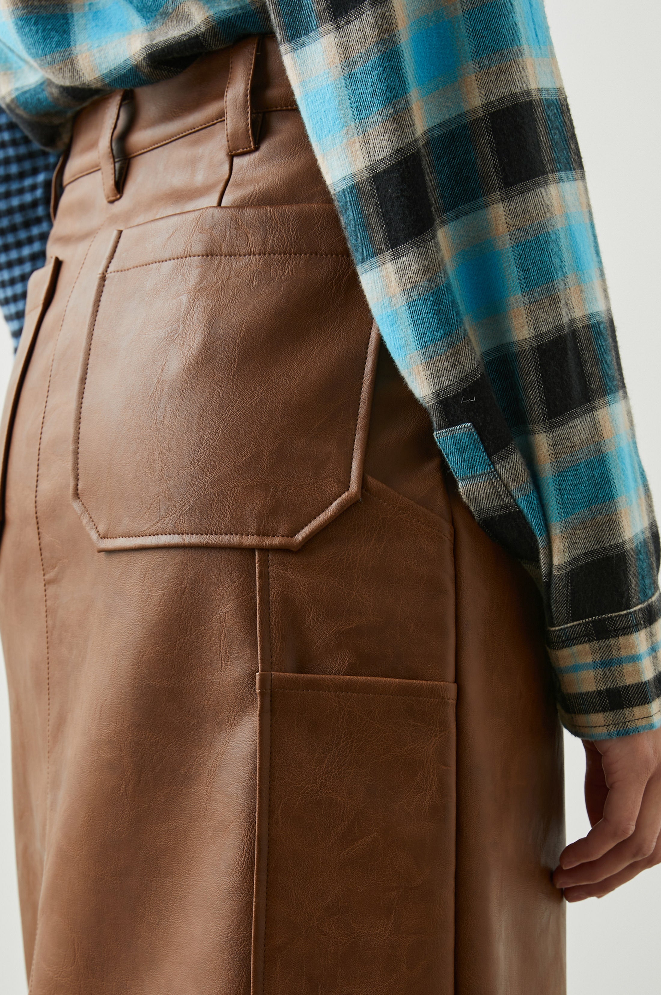 This workwear-inspired skirt is the ultimate addition to your winter wardrobe. Made from pre-tarnished faux leather and complete with eye-catching pocket details, this style pairs well with a sweater and boots or the matching Mathis Jacket.