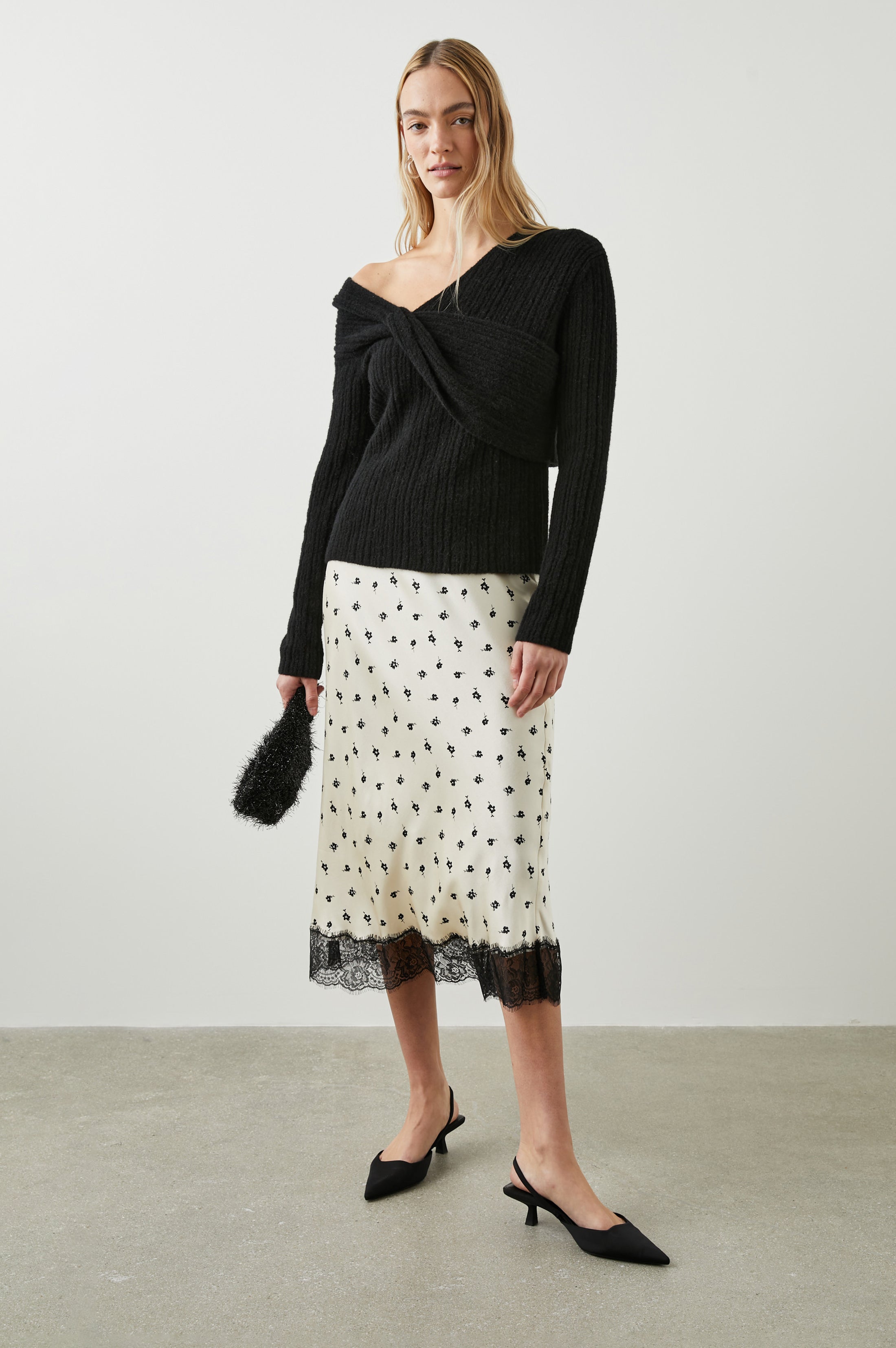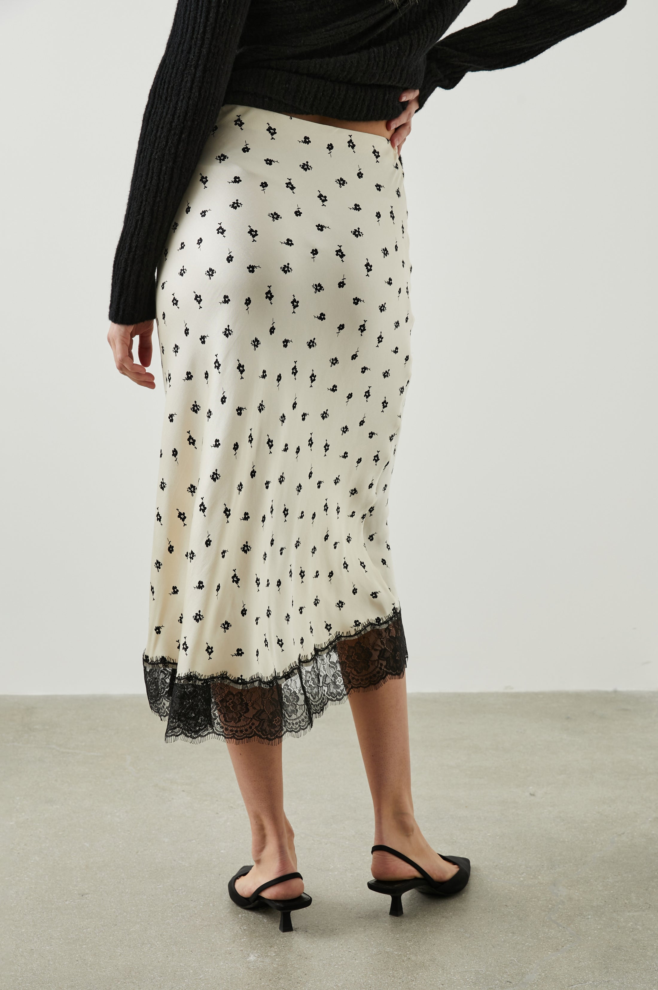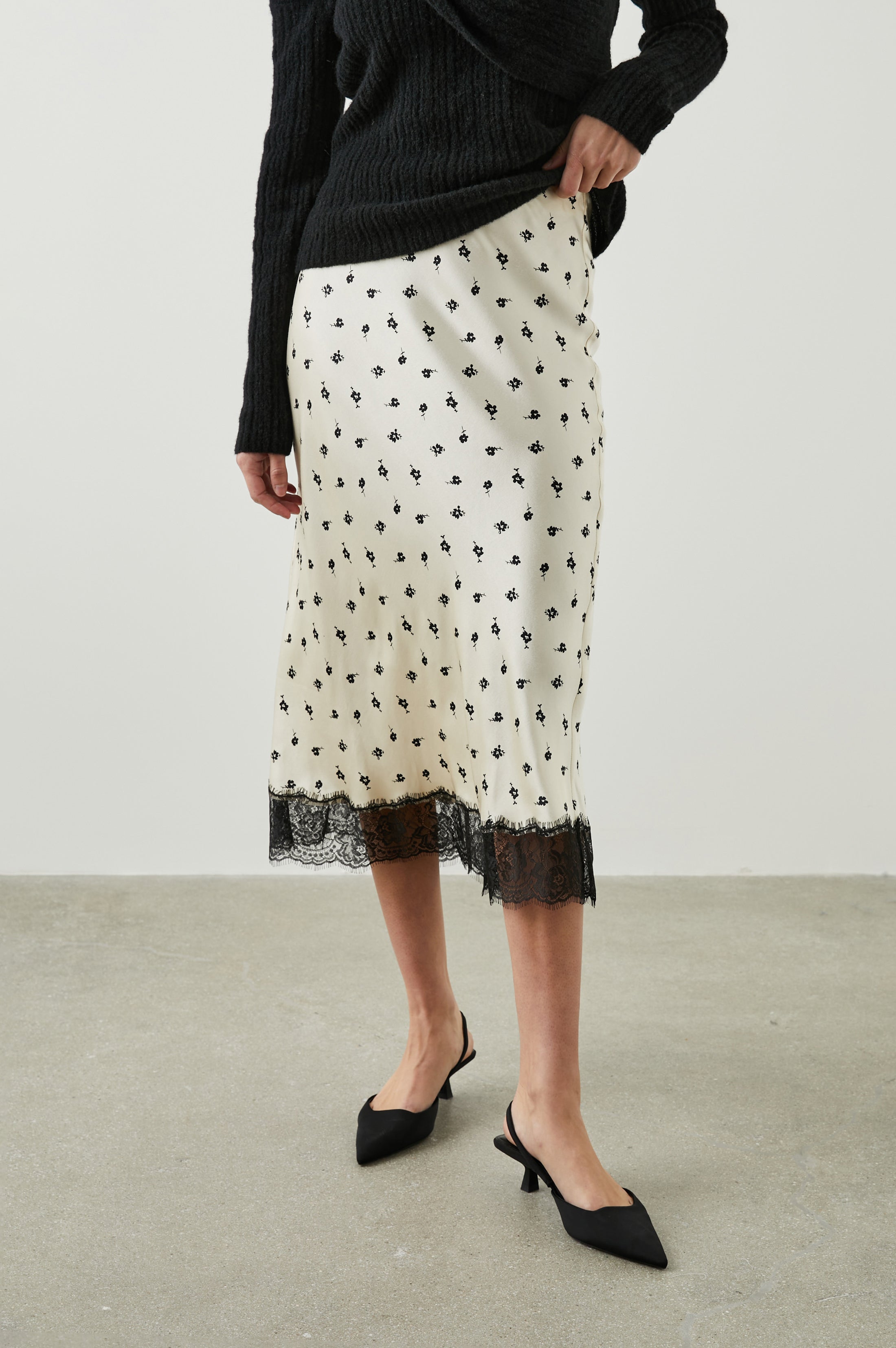 Designed to elevate your skirt collection, the Ebony features a dainty floral pattern and bottom lace trim. This style is made from luxe satin crepe and looks just as good with heels and a blouse and it does with sneakers and a tee.