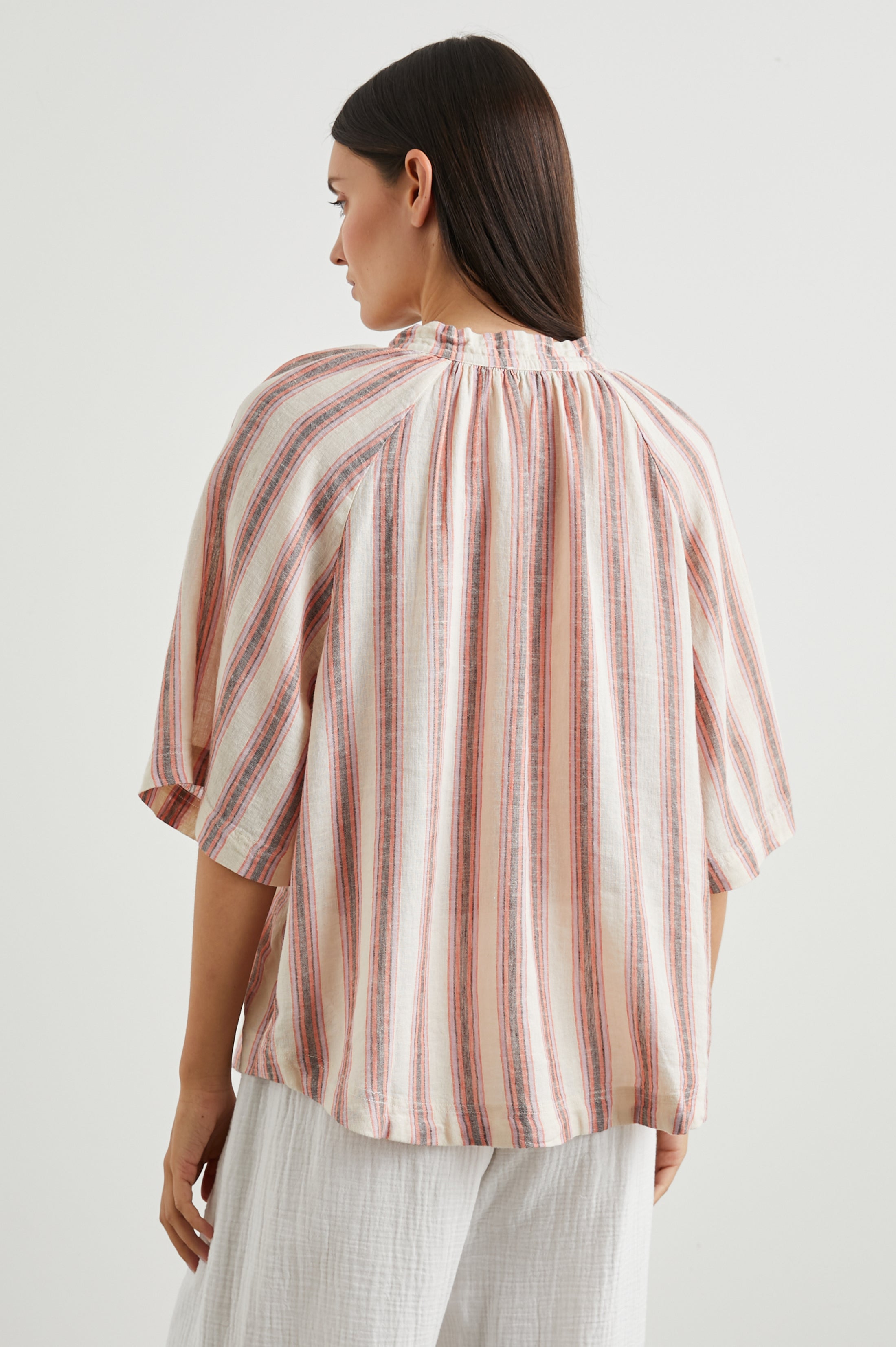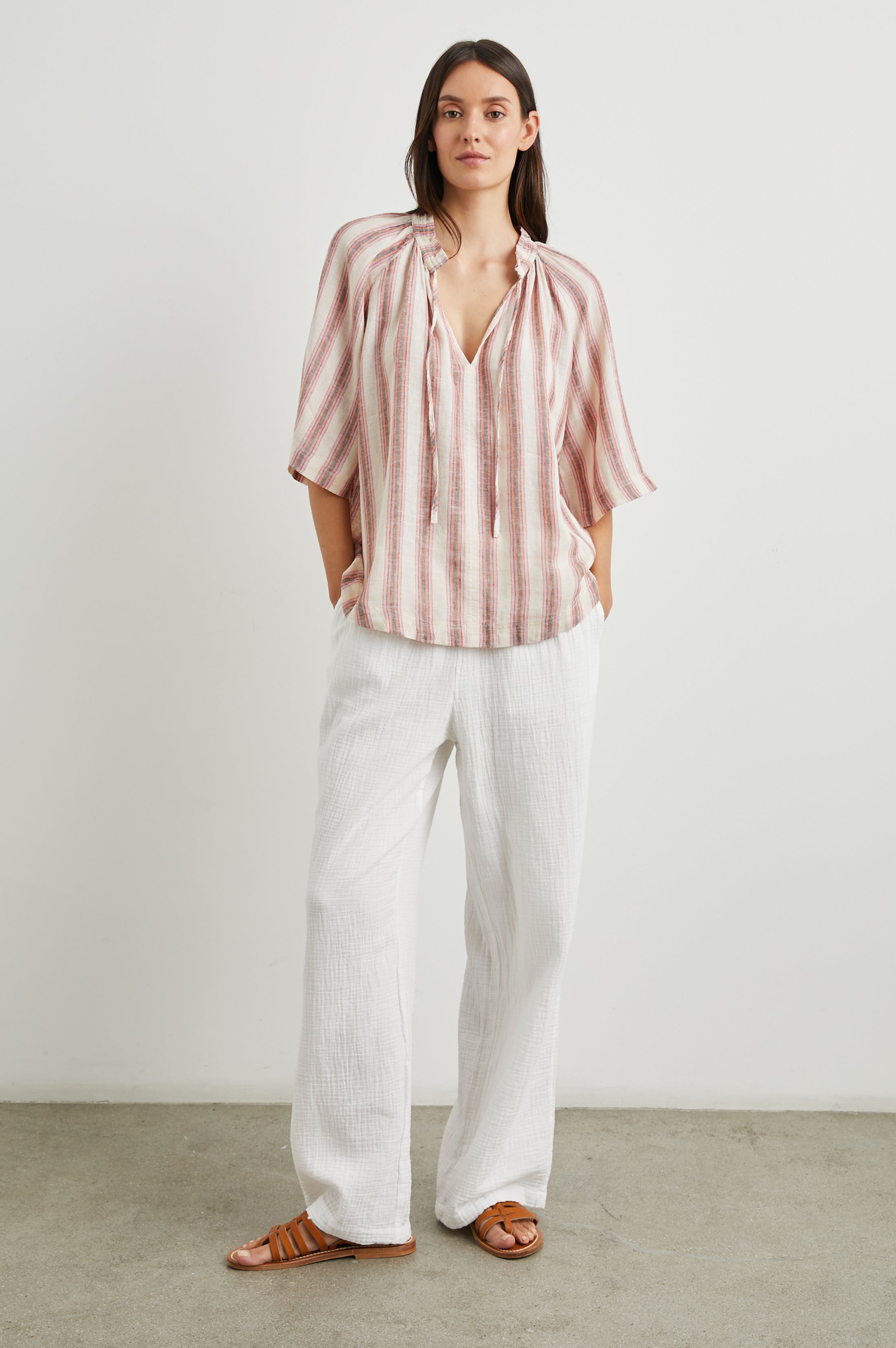 A must-have top in your wardrobe, the Eveline is lightweight, breathable, and crafted intentionally. The elastic neckline and v-cutout flatter just right, while the relaxed sleeves take your whole outfit up a notch.