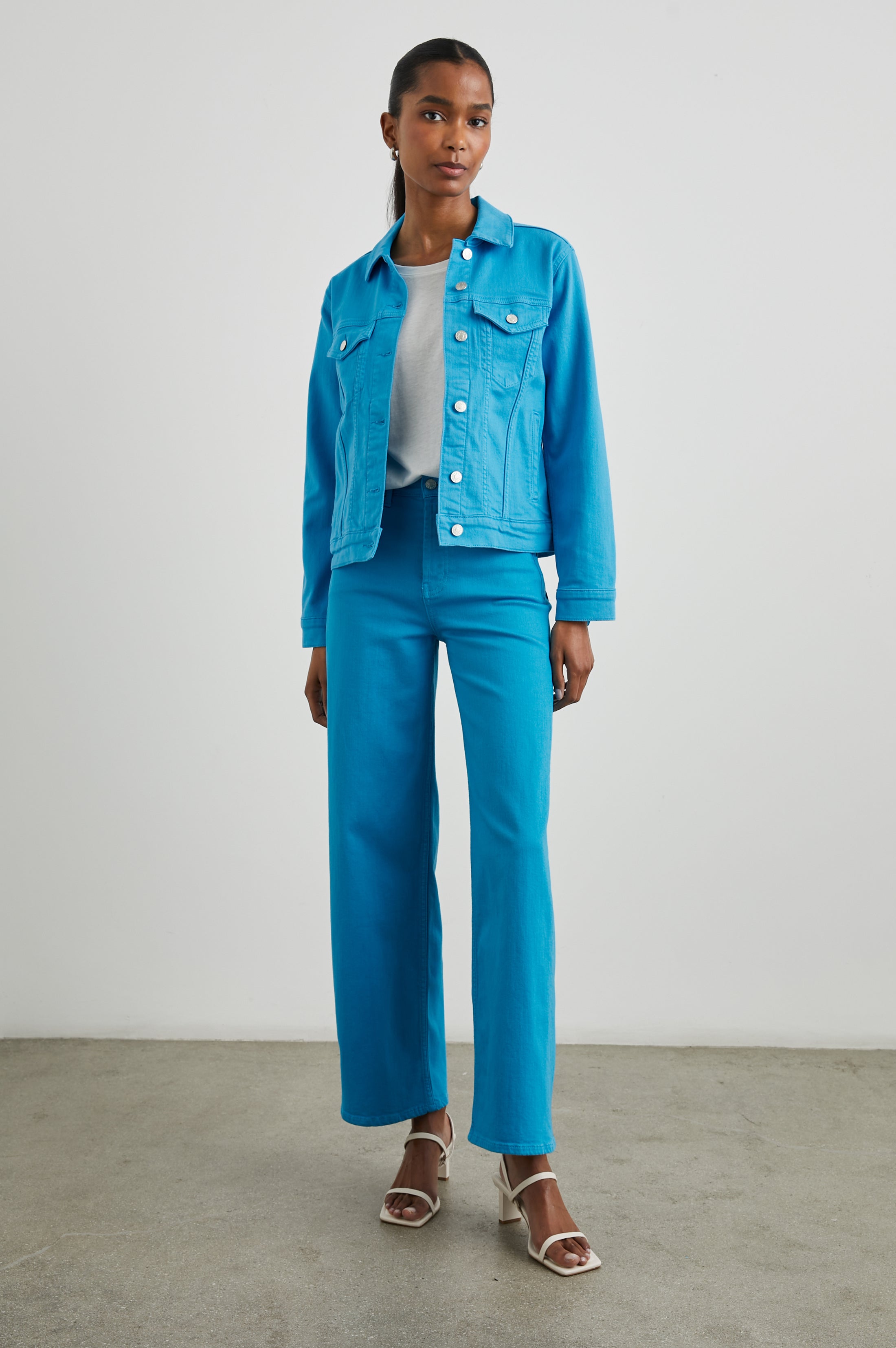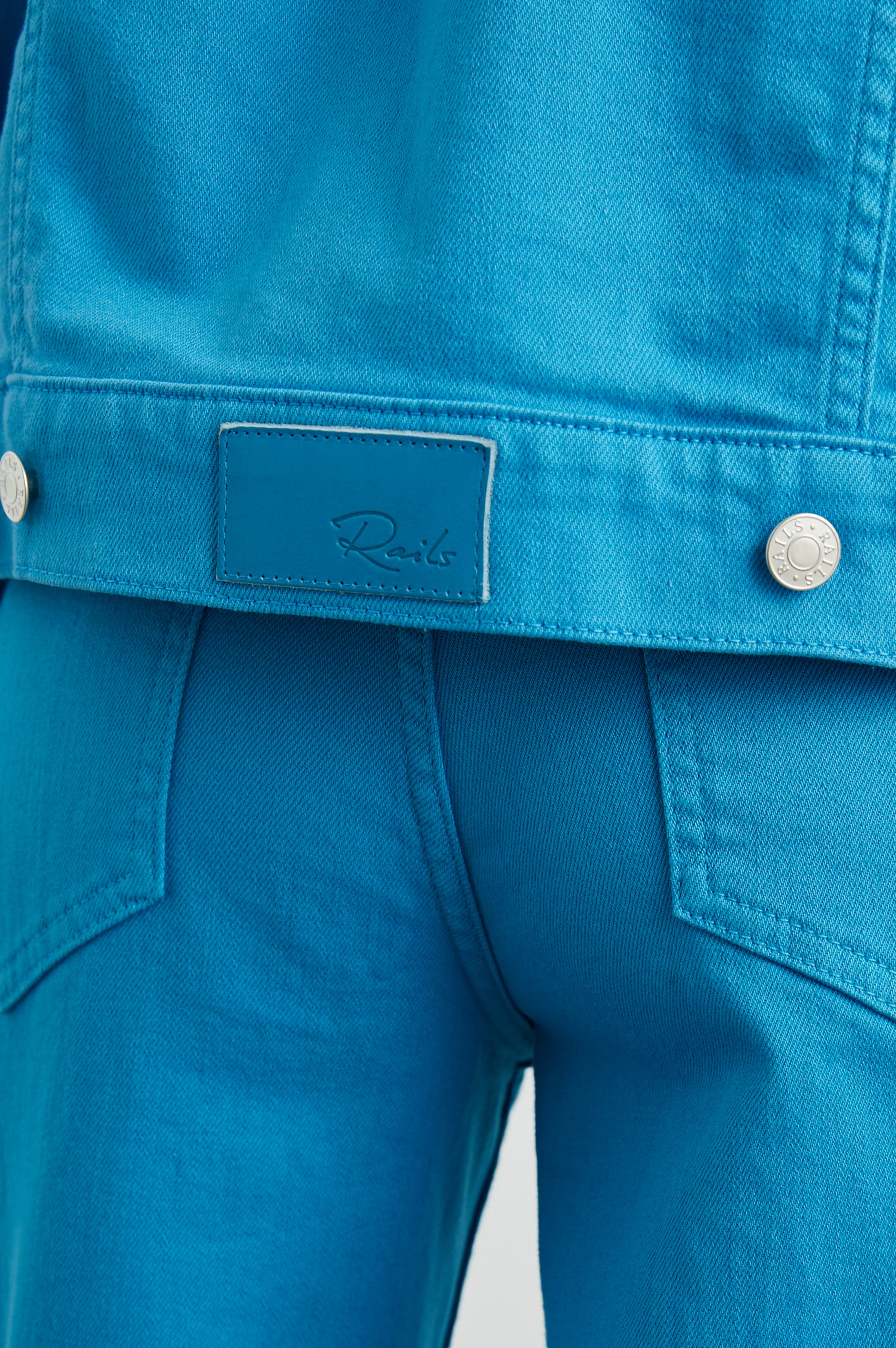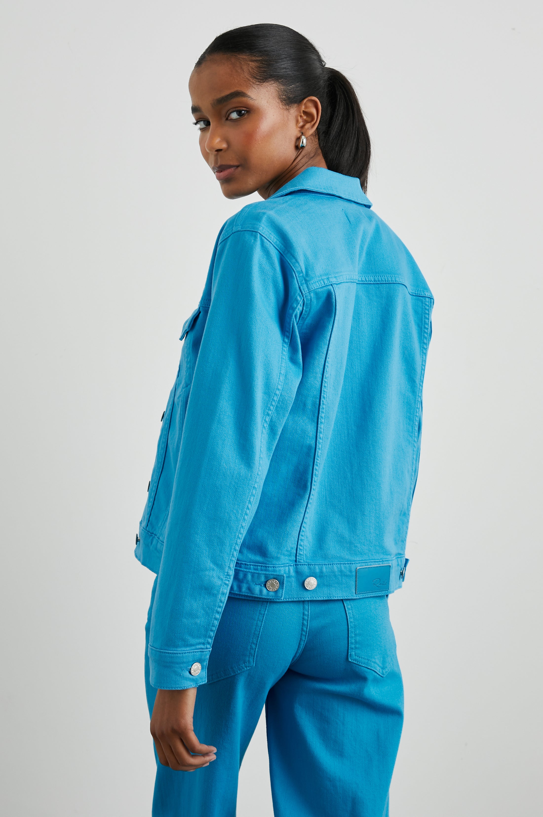 The definition of classic. Our Mulholland trucker jacket will never go out of style. Aquarius is a bright aqua blue color.