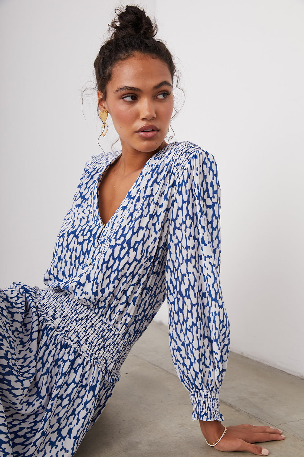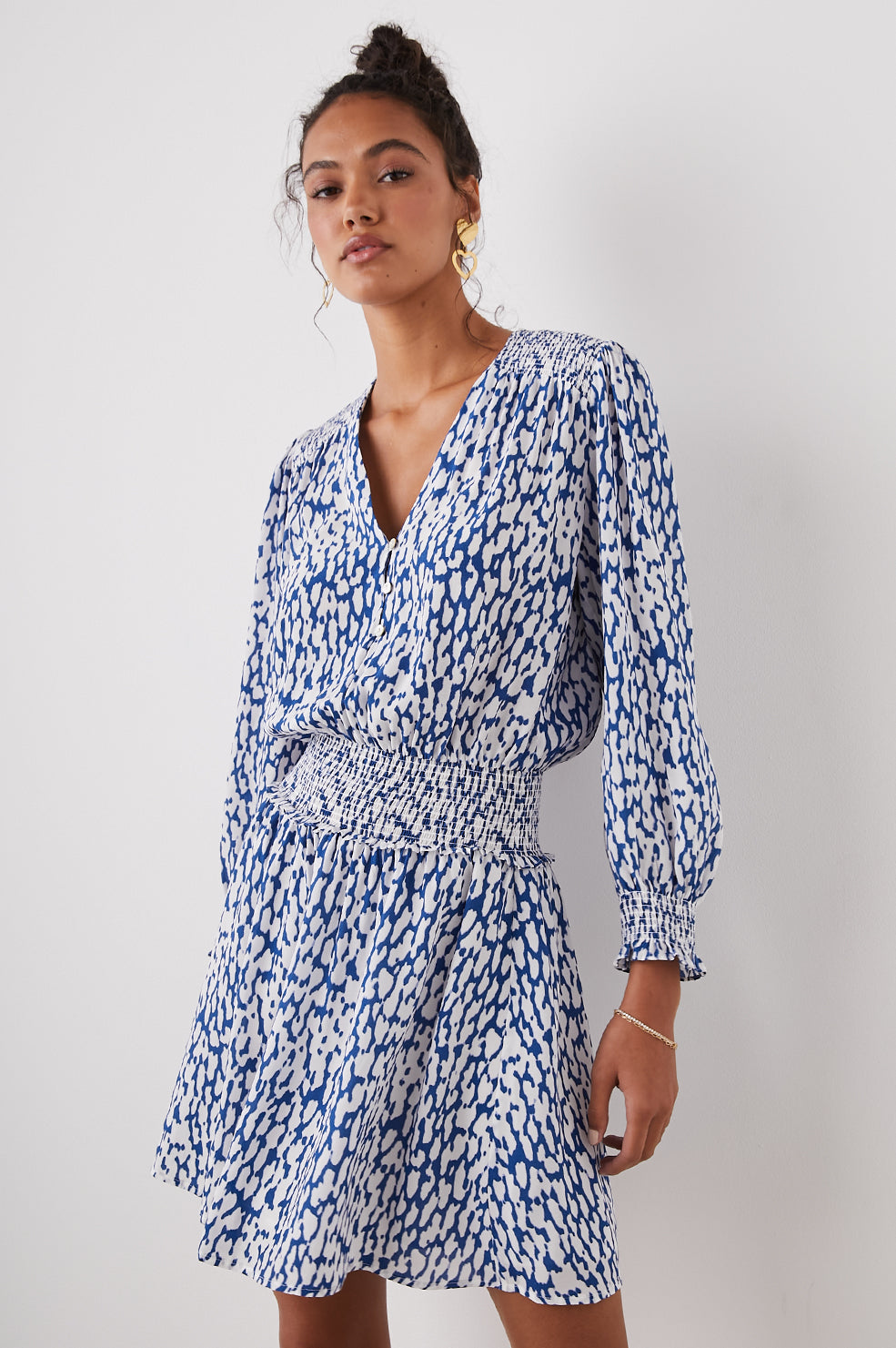 The Zana Dress embraces its feminine feel with an ultra-flattering, collarless v-neck, a flouncy, lined skirt, and smocked accents. It's crafted in a smooth rayon crepe with a playful, leopard print and finished with front-loop, natural shell buttons. Easy to wear, it pulls over the head and feels so comfortable.